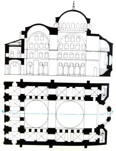 Des modifications à la structure d'origine furent d’abord apportées à l’atrium et au narthex lors de la première reconstruction sous Justinien Ier. Toutefois, le manque de symétrie de l’église fut sans doute la cause de sa destruction par un tremblement de terre en 740 lorsque son dôme s'effondra. Elle resta en ruines jusqu’à sa restauration sous l’empereur Constantin V (règne : 741-775)[10]. Les fondations durent être renforcées et on peut voir que la structure supérieure de l’édifice restauré se distingue nettement des fondations d'origine par sa maçonnerie[11]. Au niveau du sol, l’église conserve le plan basilical avec une nef centrale et deux bas-côtés, divisés par trois paires de piliers qui soutiennent les galeries au-dessus du narthex, mais on surimposa lors de la restauration un plan centré surmonté d’un dôme au niveau supérieur. L’atrium, suivi du narthex, se trouve à l’ouest, alors que l’abside polygonale percée de trois grandes fenêtres se trouve du côté est[6].
