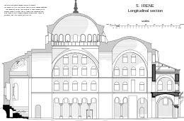 Mesurant environ 85 mètres sur 30 au sol sans l’atrium[N 1], Sainte-Irène est un des premiers exemples de transition du plan basilical à un plan centré en croix grecque. Elle est la seule église byzantine à présenter un atrium d'origine.