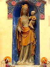 - La statue de la Vierge à l'Enfant est en pierre polychrome. Elle mesure 146 cm de hauteur, et datable du second quart du XIVe siècle. On la trouve dans la niche au-dessus de l'autel latéral de gauche de la nef, dont le décor en céramique d'Auneuil date de 1948. La Vierge est représentée debout, légèrement déhanchée. Couronnée d'un diadème fleurdelisé au-dessus d'un léger voile qui ne cache guère les cheveux, elle est vêtue d'une robe longue, et d'un manteau qui lui couvre les épaules et est ramené en tablier devant ses jambes. Dans sa main droite, Marie tient un sceptre fleurdelysé, et sur son bras gauche, elle porte l'Enfant Jésus. Celui-ci, habillé d'une tunique, tient une pomme dans sa main gauche, et bénit de sa main droite. Toute l'œuvre a été badigeonnée de gris, avec rehaussement de nombreux éléments en orange clair (suggérant l'or). Son classement remonte à avril 1902[22].