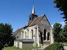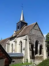 L'église est orientée un peu irrégulièrement, avec une nette déviation de l'axe vers le nord-est du côté du chevet. Cette déviation semble s'expliquer, comme souvent, par la configuration de la voirie ; elle permet en l'occurrence que la façade donne sur la place de l'Église, et que son axe soit à peu près perpendiculaire à la grande route dans sa trajectoire au nord de la place. Le plan de l'église est fort simple. Elle est à vaisseau unique, et s'organise tout en longueur, ce qui n'empêche pas des dimensions relativement généreuses pour l'église d'un petit village. L'église se compose donc d'un narthex carré dans le volume intérieur se rattache entièrement à la nef ; d'une nef inarticulée de trois travées ; et d'un chœur de deux travées terminé par un chevet plat. L'ensemble narthex et nef est recouverte d'une fausse voûte en berceau plein cintre, constitué d'un lattis plâtré sous une charpente en carène renversée. Les six entraits de la charpente traversent par ailleurs la nef, tandis que les poinçons ont été coupés. Le chœur est voûté d'ogives dès l'origine. Une grande sacristie du XIXe siècle flanque l'arrière-nef et les deux travées du chœur au sud. Elle commence, à l'ouest, par une petite chapelle voûtée qui communique avec la nef par une grande arcade[18]. Le petit clocher en charpente est placé à cheval sur la toiture de la première travée du chœur. Percé de baies abat-son au nord et au sud, il est coiffé d'une flèche octogonale, le tout entièrement recouvert d'ardoise. Une tourelle d'escalier en torchis occupe l'angle entre le chœur et le mur nord de la nef.