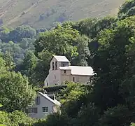 L'église est posée en surplomb de la vallée du Louron et du lac de Génos-Loudenvielle.