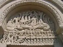 Le tympan représente la scène de l'Épiphanie. La marche des Rois Mages est orchestrée par des anges qui sonnent de l'olifant : les quatre figures ailées pourraient représenter les anges qui retiennent les 4 vents aux 4 coins du monde.