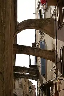 Vue du clocher et d'une partie de l'église depuis les étroites ruelles de la citadelle. | |