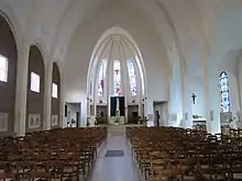 C'est un bâtiment de béton armé recouvert de briques roses pour l'extérieur. L’intérieur bénéficie d’une belle luminosité, par la blancheur de ses murs et les vitraux modernes du maitre-verrier Mauméjean. Leur restauration est toutefois prévue à la fin des années 2010[5].