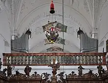 Une autre donation permit en 1512 la construction d’une galerie occidentale dans le chœur des frères, desservie par un escalier à vis en terre cuite. Cette tribune – sur laquelle figuraient deux autels (donnés en 1955 à l’abbaye d’Ottobeuren) – était réservée aux hôtes du couvent et permettait d’accéder directement à l’hôtellerie conventuelle. En 1680, commencèrent les premières études relatives à la baroquisation de l’église, les travaux proprement dits étant exécutés de 1709 à 1711. À cette occasion, on fit l’acquisition de tableaux de peintre Johann Friedrich Sichelbein, de Memmingen, tandis que les célèbres stalles baroques ont été sculptées par Ignaz Waibel[3]. Dans le chœur des moines, on supprima les ogives gothiques, dans celui des frères, on les transforma. La baroquisation des fenêtres fut entreprise par les frères Zimmermann, occupés à la chartreuse entre 1709 et 1741. Les remplages gothiques furent remplacés par des fenêtres en plein cintre, à décor en stuc[* 2]. Dominikus Zimmermann renouvelle alors la charpente sous la direction du maître maçon Christian Wiedemann, du couvent d’Elchingen. On construisit à cette occasion, dans le comble au-dessus du chœur des moines, des arcs maçonnés qui passent encore aujourd’hui encore pour audacieux[4].