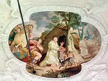 Le quatrième et dernier médaillon du chœur des moines, dans la travée occidentale, a pour thème l’invitation à Rome de saint Bruno. Il y est appelé comme conseiller de son ancien élève, le pape Urbain II. Au centre, Bruno de Cologne, vêtu de son vêtement monastique blanc, est agenouillé dans son oratoire doté d’un autel de pierre portant une petite croix. Son visage est tourné vers un messager agenouillé à gauche et dont les mains jointes expriment l’invitation à le suivre. Derrière le messager, un cheval blanc fougueux, qui veut déjà se mettre en mouvement, est retenu au moyen de rênes tenues par deux hommes. À premier plan, deux chiens regardent Bruno avec curiosité. L’oratoire du saint n’est protégé que par un modeste toit de planches, auquel s’ajoute la frondaison de l’arbre voisin. À côté de l’arbre, on voit un paysage, avec deux moines chartreux au travail de la terre. La partie supérieure du médaillon est occupée par le ciel.