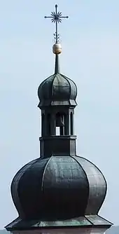 Le clocheton à l’extrémité occidentale de la toiture, comporte un bulbe sommé d’une lanterne, garnie d’une cloche. La pointe forme une croix.
