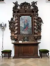 Au-dessus des colonnes, sur les parties arrondies d’un fronton brisé, sont assises les figures de sainte Marie-Madeleine et de sainte Catherine d’Alexandrie. Côté nord, Marie-Madeleine, vêtue d’une robe dorée, porte un voile d’or. Elle tient dans sa main droite un crâne, sans sa gauche un pot de myrrhe. Catherine d’Alexandrie est vêtue d’un habit d’or et de turquoise. Sa main gauche empoigne une épée. Derrière elle se trouve son second attribut, une roue brisée. Entre les deux, sur la console centrale, la Vierge Marie se détache sur une couronne de rayons. Elle est représentée comme une madone sur un croissant de lune et porte un manteau doré, une robe blanche et une couronne, sous laquelle jaillit sa chevelure brune. De la main gauche elle tient l’Enfant Jésus nu, de la droite, un sceptre d’or. L’Enfant Jésus porte dans sa main gauche l’orbe et la croix. L’ensemble est entouré d’anges et de putti.