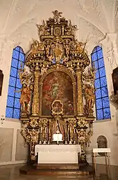 L’autel, en bois brun, comporte quatre niveaux à décor richement doré. Entre deux anges, le tabernacle se présente comme un édicule avec baldaquin et couronne dorée. Par-dessus, un grand retable illustre l’Assomption de Marie, avec son accueil aux cieux et son couronnement par la sainte Trinité. Il est signé «J. G. Bergmiller Aug. Vind, 1718». Ce tableau est précédé, dans la partie inférieure, par un portrait du Christ en Salvator Mundi. De part et d’autre du grand retable, des atlantes portent des colonnes garnies de feuilles de lierre dorées.