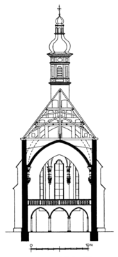 La première église a sans doute été construite lors de la fondation de cet ensemble religieux vers l’an 1100. L’actuel chœur des moines date sans doute du XIIIe siècle, on suppose qu’à l’origine il constituait l’église collégiale de la première congrégation. Il s’agissait alors d’une construction en briques, non crépies, avec des fenêtres à remplages en tiers-point et des voûtes gothiques. Les chartreux ayant reçu le couvent en 1402, une donation leur permit en 1435 de se procurer un grand retable. La plus importante transformation architecturale consista en la construction d’un chœur des frères, avec jubé, élevé vers 1450 par le frère-lai Collmanus pour la séparation des moines et des frères-lais. Au nord du chœur des moines, on construisit une sacristie sur deux niveaux, dont l’étage fut destiné à la conservation des archives du couvent[* 1].