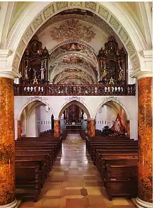 Les fresques du chœur des frères ont été peintes par Johann Baptist Zimmermann dans les années 1711-1713. Elles sont cernées de cadres chantournés en stuc et illustrent des moines chartreux[10].