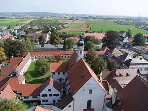 L’église orientée occupe une position centrale dans l’ancien complexe conventuel situé sur une hauteur de la partie inférieure de la vallé de l’Iller. Le bras occidental du promenoir du cloître sépare comme un tunnel le chœur des moines de celui des frères[2].