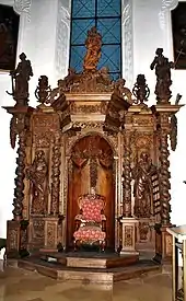 Son abri monumental, auquel on accédait par deux marches, est conservé. Il est dominé par les allégories des trois principales vertus théologiques, la Foi, l’Espérance et l’Amour, et flanqué, de part et d’autre, par une paire de colonnes agrémentées de pampres. Les colonnes intérieures portent des têtes d’angelots. Les figures sculptées sur les colonnes extérieures illustrent Spes (l’Espérance, avec une ancre), Fides (la Foi, avec une croix). Entre ces paires de colonnes, des niches sont garnies des statues de deux diacres ; à droite, saint Étienne, à gauche, saint Laurent de Rome. Les figures élégantes sont légèrement déhanchées. La niche du siège de célébrant comporte une paroi arrondie en forme d’absidiole, ornée de coquillages et de fleurs. Elle est coiffée d’un baldaquin hexagonal et couronnée de feuillages en volutes avec les têtes d’angelots et une statue de Caritas (la Charité). Celle-ci porte un ample vêtement et tient sur son bras droit un enfant. Sa main caresse la tête d’un second enfant, qui se serre contre elle[9]. Une photo, prise après les travaux des années 1950-1980, atteste que lors de la dernière restauration, les statues de Fides et de Caritas ont été interchangées. Anciennement, la Foi occupait le centre du couronnement[* 4].