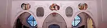Les trois travées sous la galerie sont ornées chacune d’une fresque. Ces scènes mariales sont du même genre que celles qui ornent les voûtes du jubé. La peinture du centre est accompagnée de quatre emblèmes mariaux également peints à la fresque[* 8].