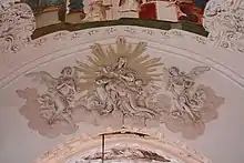 La première fresque en quadrilobe, à l’est du chœur, montre la glorification du cœur de Jésus. Le centre du tableau est occupé par un cœur entouré de flammes. Une couronne d’épines entoure le cœur en souvenir de la Passion du Christ, sur le flanc gauche, on observe la plaie béante. D’une ouverture en forme d’entonnoir jaillit une grande flamme qui éclaire le trigramme du Christ IHS muni d’une croix. Sous le cœur est assis, sur un nuage, un ange en sandales, vêtu de jaune avec une écharpe bleue. Il balance un encensoir en direction du cœur, signe de respect et de prière. De part et d’autre voltigent des groupes de putti portant les instruments de la Passion. À droite un ange, aidé de putti, porte la croix et les clous. À gauche, plusieurs putti portent la colonne de la flagellation, les verges et les fouets, ainsi que l’éponge de vinaigre et la lance. Les putti au premier plan tournent le dos au spectateur. Leurs pieds, en stuc peint, font saillie sur le cadre. Sur le bord inférieur de la fresque, une balustrade blanche est animée de putti et de fleurs.