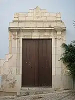 La façade est simple, dénudée, et seul se détache le portail en plein cintre où les voussoirs sont entourés par une imposte et par une moulure circulaire.