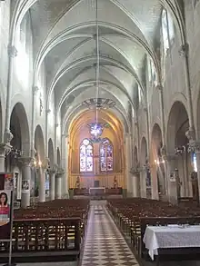 À l'extérieur, l'église est de style néogothique, mais à l'intérieur sa nef est séparée par des voûtes en plein cintre. Ses vitraux sont l'œuvre de la maison Tournel frères et datent de 1927. Ils représentent les épisodes de la vie de Jésus. L'un d'eux, dans la chapelle des Morts, représente les soldats morts pendant la Grande Guerre, protégés par Jésus et sa Mère.