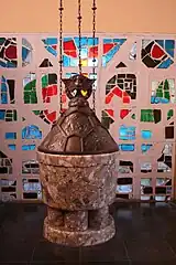 - Les fonts baptismaux, datant de 1935, sont l'œuvre des ateliers d'art de l'abbaye de Maredsous.