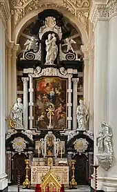 L'accès à l'église se fait par cinq marches flanquées de deux rampes rondes. La façade ouest montre clairement les influences de l’Église du Gesù de Rome (probablement inspirée du séjour de Huyssen à Rome de 1626 à 1628), entre autres par sa structure en deux parties, mais aussi avec des proportions abruptes et une élaboration sculpturale. Une haute sous-structure est dotée de pilastres d'angle structurés rythmiquement et de pilastres à colonnes de trois quarts, des deux côtés de la nef centrale, le tout avec des bases profilées et des chapiteaux corinthiens finement travaillés ; la corniche en encorbellement porte la date de la consécration 1643. La partie centrale surélevée est conçue avec une élévation comparable sous un entablement fortement profilé et cannelé, qui est surmonté d'un pignon triangulaire brisé entre des vases décoratifs et un crucifix en bronze du XIXe siècle. Les ailes latérales sont ornées de volutes décoratives et de couronnes de candélabres. Le Portique présente des chapiteaux et un fronton, interrompus par une niche avec la statue de Saint François Xavier (copie des années 1970).