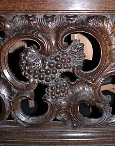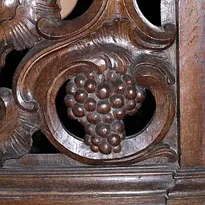 Le fond de la nef est orné d'un banc en chêne, probablement le banc de communion déplacé depuis le chœur lors de l'ajout d'un autel orienté vers les fidèles dans l'esprit du Concile Vatican II). Chaque section de ce banc présente trois panneaux ajourés où sont figurés divers motifs sculptés comme des feuilles de vigne, des grappes de raisin et des épis de blé.