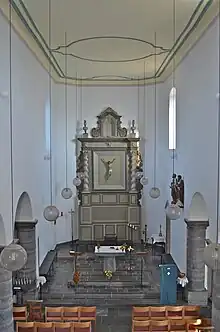 Le chœur est surélevé par rapport au sol de la nef. Le premier niveau d'élévation du chœur est caractérisé par les deux portes se faisant face, et donnant accès aux sacristies qui encadrent le chœur. Le chambranle en bois est façonné à la façon de deux pilastres antiques surmontées d'un tympan triangulaire posé sur un linteau. De grandes baies latérales, alignées avec les portes marquent le second niveau d'élévation. Le plafond plat est une prolongation du plafond de la nef.