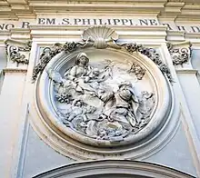 La façade de Fiori est une construction à trois axes et à deux étages. Les trois axes sont formés par des lésènes d'ordre colossal, d'une variante de l'ordre ionique. Des festons sont disposés entre les volutes des chapiteaux. Le portail est voûté par un tympan en arc brisé continu ; les travées des axes latéraux sont simplement segmentées[4]. Au premier étage, l'axe central fait saillie à la manière d'un avant-corps, et l'élément ainsi créé contient un haut médaillon en stuc de forme ovale représentant Saint Philippe accueilli au ciel par la Vierge à l'Enfant, avec une gloire d'angelots, encadré de fenêtres décoré de figures en stuc[5],[2]. Les fenêtres latérales sont surmontées de tympans arqués segmentés en saillie[9].