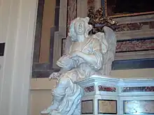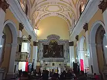 À l'intérieur à droite, on remarque une balle, enlevée de la façade extérieure après un bombardement de la Seconde Guerre mondiale. Sur la gauche une plaque est posée à terre au milieu de l'atrium. Le maître-autel polychrome est particulièrement remarquable. Des sculptures d'anges et des tableaux ont été enlevés par le ministère des biens et activités culturels et placés dans des musées et autres lieux. Sur les côtés, on remarque les deux ronds de marbre représentant La Vierge à l'Enfant du XVIe siècle[2].