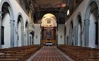 L'intérieur comporte six chapelles de chaque côté, crépies de blanc, agrémentées des fresques en pietra serena de style brunelleschiano, dont les autels furent, entre 1480 et 1530, garnis de retables d'artistes de premier ordre tels que Sandro Botticelli, le Pérugin, Domenico et Ridolfo Ghirlandaio, de Lorenzo di Credi et de Raffaellino del Garbo, transférés pendant les restructurations du XVIIIe siècle