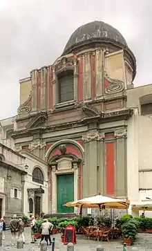 L'église est adossée à un corps de bâtiment latéral composé de la chapelle Pontano datant de 1492 et de la chapelle du Sauveur datant du XVIIIe siècle. L'église présente deux ordres reliés par des volutes de tuf en stuc. Le premier ordre est ionique et le second, corinthien, n'est plus visible à cause de l'écroulement du tympan triangulaire qui a fait disparaître les chapiteaux des lésènes.