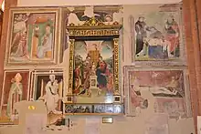 Dans le transept sur le mur gauche, il y a de nombreuses et précieuses fresques votives attribuées au cercle de Michelino da Besozzo et datées entre la première et la quatrième décennie du XVe siècle[5], et un retable de Bernardino Lanzani de 1515[6].