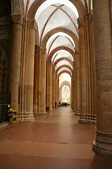 L'église a un plan rectangulaire dans lequel se trouve un plan en croix latine à trois nefs flanquées de chapelles carrées obtenues à partir du remodelage des nefs les plus extérieures (à l'origine l'usine avait cinq nefs). Les dimensions du plan sont considérables : près de 80 mètres de long sur 40 de large[1]. La grande taille de l'église est liée à l'appartenance aux Carmélites, un ordre de frères prêcheurs. Les proportions de la construction sont basées sur le module ad quadratum, qui implique l'utilisation d'un seul élément de base carré répété en largeur, longueur et hauteur[3]. La nef centrale, deux fois plus haute que les plus petites, est subdivisée en quatre travées carrées qui, dans les bas-côtés, sont elles-mêmes subdivisées en deux clochers carrés ouverts sur deux chapelles, toujours de plan carré. Les voûtes sont en arc croisé et les nervures qui divisent la structure des voûtes sont en terre cuite pour former un élément chromatique en contraste avec le plâtre clair. Les piliers ont également une combinaison chromatique avec de la terre cuite et de la pierre grise d'Angera[1].