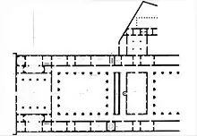 Le tablinum est l'un des plus purs exemple de classicisme palladien : les colonnes libres et les terminaisons absidiales sont probablement inspirées des vestiges de salles similaires localisées autour du frigidarium des thermes de Caracalla et utilisées par Palladio dans la reconstruction d'autres thermes. Le contraste chromatique entre les éléments des trois ordres est particulièrement singulier : la frise le long du mur, de couleur rouge, vient se greffer sur un entablement en pierre blanche, à son tour soutenu par une colonne en marbre rouge. La même accentuation bichromique se retrouve dans les puissants murs à ordre superposé du cloître qui doit beaucoup à la cour du palais Farnèse. La texture du mur est réalisée avec des briques laissées à la vue, protégées par une peinture rouge, pendant que les chapiteaux, la base et les clés de voûte sont réalisés en pierre blanche.