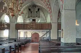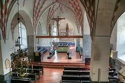 La nef rectangulaire à trois vaisseaux comporte une sacristie du côté nord et une salle d'armes du côté sud, à l'ouest de l'axe central.
