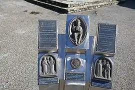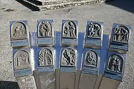 - un carillon automatique de 23 cloches, dont les trois plus grosses mobiles, peuvent sonner à la volée[5],[6]. Chacune des 23 cloches (fondues par la fonderie Paccard d'Annecy en Haute-Savoie[7]) a un nom et est décorée de bas-reliefs (reproduits au sol) des épisodes des évangiles de la Bible, réalisés par le sculpteur Claude Dekumbis de Massongex[8] et par les moniales du Monastère de Bethléem des Voirons en Haute-Savoie. La cloche du jubilé a été bénite par le pape Jean-Paul II en 2000 à la Basilique Saint-Pierre de Rome.