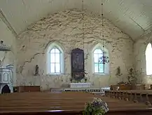 Les ouvertures fenêtres à l'extrémité ouest de la nef sont d'origine. La nef voûtée en berceau a un plancher peint[2].