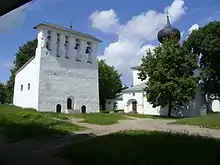 Cet édifice marquait à l'origine l'endroit de passage de la rivière sur un bac. Le cours de la Velikaïa est lent mais les eaux sont abondantes. Sa silhouette bien dégagée est fort découpée. Le clocher-arcade est détaché de l'ensemble et tourne sa façade vers le krom de Pskov. L'ensemble des bâtiments ressemble de loin à un petit village[2].