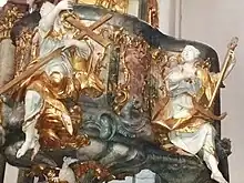 La chaire de Johann Michael Fischer est particulièrement remarquable. Il a placé les symboles des Évangélistes à ses pieds et au-dessus les vertus théologales. La Foi est symbolisée par la Croix, l'Espérance par l'ancre et la Charité par un enfant avec un cœur enflammé. Les allégories des quatre continents décorent l'abat-voix qui est couronné par un ange triomphant, évoquant les missions jésuites.