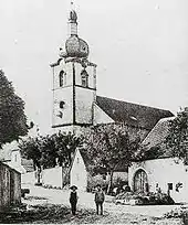 Au début du XXe siècle, on voit encore la tour, sans doute romane, de l'ancienne église paroissiale, accolée à la maison d'école, dont il ne subsiste plus aujourd'hui que la trace d'un arc sur le mur-pignon. Avant la Seconde Guerre mondiale, un vieux mur entoure le cimetière et l'église se dresse derrière une rangée de tilleuls, avec sa haute tour. Après la guerre, les parties hautes de la tour sont refaites et un modeste toit en pavillon surmonté d'un lanternon remplace le bulbe polygonal qui coiffait le clocher.
