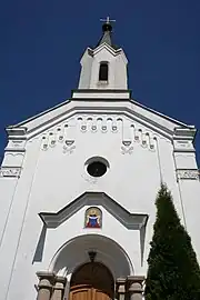À l'extérieur, les façades sont richement décorées. À l'ouest, le portail principal est encadré de colonnes et de piliers et surmonté par un fronton ; les façades sud et nord possèdent la même structure que la façade occidentale. Cette façade est dominée par un haut clocher hexagonal de style néo-gothique. Cette rupture stylistique dans une église datant de la seconde moitié du XIXe siècle s'explique par le fait que les constructeurs de l'église venaient de Dalmatie[4]. Au-dessus du portail principal se trouve une petite rosace dépourvue de décoration ; deux autres rosettes ornent les façades latérales du narthex[4]. Dans un la partie supérieure de toutes les façades court une série d'arcatures aveugles surmontées par une corniche ; les façades latérales sont dotées chacune de deux grandes fenêtres, tandis que l'abside possède une ouverture centrale et deux autres plus petites pour les niches de la proscomidie et du diakonikon[4]. Toutes les façades sont rythmées par des pilastres peu profonds dont le sommet est décoré de feuilles stylisées[4].