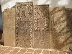 Intérieur de l'ancienne église, avec pierres tombales | ||