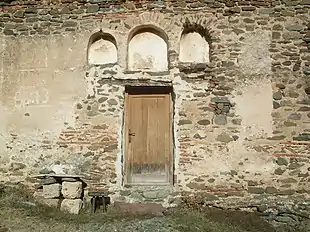 L'édifice est constitué d'une nef unique prolongée par une abside demi-circulaire à l'extérieur ; sa voûte en berceau ne porte pas de coupole[5]. Le caractère décoratif de la maçonnerie est particulièrement mis en valeur au niveau de cette abside grâce à des bandes de briques disposées en zigzag qui s'insèrent dans les pierres et au niveau de la frise double du toit en dent de scie[5] ; la porte d'entrée, au sud, est surmontée de trois niches aveugles[2],[3],[5].