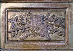 - Plus en arrière, lambris, stalles et sellettes de reliquaire, en noyer, édifiés par le maître-menuisier arlésien Joseph Severa et sculptés par Jean-Baptiste Laroche, en 1716[8], classés au titre objet des monuments historiques depuis le [23], et surplombés d'un retable comprenant