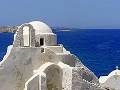 Cette église byzantine-cycladique pittoresque, blanchie à la chaux et dépouillée d’ornementation, est typique de l'architecture des Cyclades.
