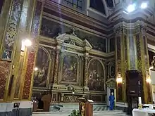 En partant de la gauche, la première chapelle abrite La Mort de saint Joseph de Paolo de Matteis, avec des œuvres de Domenico Fiasella provenant de l'église voisine Saint-Georges-des-Génois sur les murs de côté; la troisième chapelle possède un tableau sur panneau de L'Annonciation, attribué récemment à Belisario Corenzio; la quatrième chapelle est dédiée à saint Nicolas dont l'histoire est racontée par un cycle de fresques en mauvais état de conservation, de la main d'Agostino Beltrano; dans la cinquième chapelle, on trouve au milieu L'Ange gardien de Filippo Vitale, accompagné d'une Déposition de Luca Giordano et d'une Résurrection du Christ de Paolo de Matteis. La grande chapelle du transept de gauche est l'œuvre de Giacinto Diano vers 1780 avec des représentations liées à la Nativité de Jésus; la Pietà du maître-autel appartient à cette époque. Du transept de gauche, l'on accède à la sacristie où se trouve La Nativité de Juan Do, artiste espagnol lié à Ribera. On remarque dans l'abside L'Invention de la Croix de Luca Giordano, réalisée à l'origine pour la sacristie. Giordano était alors chargé de la décoration de la coupole, pour laquelle il peignit une toile représentant L'Ascension qui a été détruite par les bombardements américains de 1943.