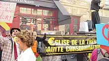 L'Église de la Très Sainte Consommation est une parodie de religion qui tourne en ridicule les comportements consuméristes de la civilisation occidentale par le biais de représentations publiques mimant des prières collectives à la gloire de la consommation.