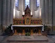Le maître-autel, en pierres sculptées polychromes, date de 1873. Réalisé à l’atelier Saint-Joseph dans la Doutre, il comprend un motif trinitaire (statue sommitale) plutôt rare inspiré de l'art italien et les apôtres entourant Jésus. Ce dernier motif, plus usuel, présente toutefois la particularité d'avoir Judas remplacé par Paul. Au centre se trouve un tabernacle dont la porte représente un christ enseignant sur fond émaillé.