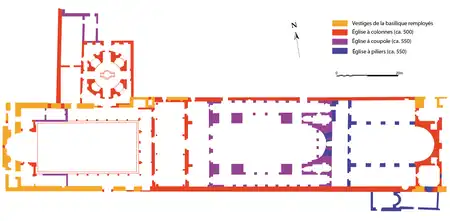 Suite probablement à sa destruction dans un fort tremblement de terre, qui serait daté de 557, l’église est profondément transformée et dédoublée[15]. Les colonnes de la partie orientale, devant l’abside, sont remplacées par des piliers, et un narthex transversal vient couper le vaisseau de l’église précédente, limitant la longueur de la nef désormais à 23 m. Ce narthex devient rapidement un espace d’inhumation privilégiée (au départ, seuls les membres du clergé y sont enterrés)[16]. Le sanctuaire connaît plusieurs modifications du dispositif de clôture et du synthronon dans la seconde moitié du VIe siècle : le templon est pourvu d’une solea le reliant à l’ambon qui est installé seulement à cette époque (probablement vers 600) à l’extérieur du bêma, au milieu de la nef[17]..