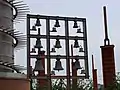 Une cheminée industrielle fait office de clocher. L'église a une capacité de mille places environ.