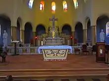 L’autel principal et les autels latéraux sont de marbre blanc. Les ornementations de ferronneries d'art en bronze doré, représentant des symboles bibliques, sont dues au maître serrurier Eugène Goulon.