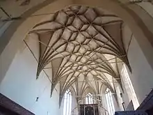 L'église-halle à trois nefs conserve une conception proche de l'original, c'était la dernière église de ce type construite en Transylvanie, elle a été bâtie entre 1486 et 1524[1] sur le site d'une église romane antérieure[1]. Dédiée à la Vierge Marie et construite dans un style gothique tardif avec des touches Renaissance[1], la structure a été contrainte par le paysage vallonné. Le chœur mesure 18 m de long, avec un plafond voûté d'ogives, tandis que les trois nefs d'égale hauteur sont également voûtées d'ogives. Un niveau défensif au-dessus du chœur comporte des parapets et un créneau[1]. Un deuxième niveau, en bois, a été démoli en 1803. Le retable du polyptyque comporte 28 panneaux exécutés entre 1482 et 1513 par un peintre vraisemblablement formé à Vienne et à Nuremberg. Au centre, un groupe sculpté : un crucifix avec Jésus-Christ suspendu, Marie debout et Marie-Madeleine embrassant la croix. Les panneaux latéraux supérieurs montrent des visions d'Ézéchiel et d'Auguste[1]. La chaire de pierre, qui montre des scènes sculptées en relief, date de 1523. La porte intarsia richement décorée de la sacristie possède une serrure complexe, exposée à l'Exposition universelle de Paris de 1889. Son système central bloque la porte en treize points, assurant la sécurité des objets de valeur conservés dans la sacristie.